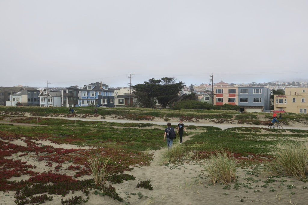 My favorite part was that the weather was very nice. It was warm enough to walk around without any jacket, yet it was also still foggy. This added an almost surreal feeling when walking. I could feel the fog on my skin, yet I was warm. While walking from the street to the beach there were a few mounds of sand with plants. We rested on those which gave us an elevated view of the city.